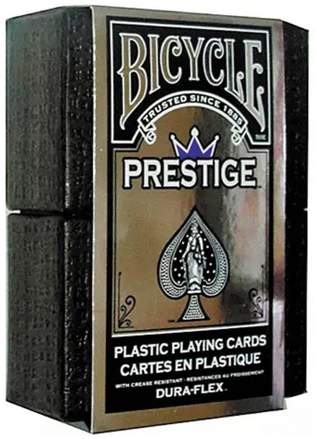 Muchos profesionales prefieren la flexibilidad y durabilidad de las cartas de plástico. Las cartas Bicycle Prestige ofrecen una durabilidad inigualable. Es la única tarjeta 100% plástica que ofrece una sensación similar al papel para barajar y manejar fácilmente.