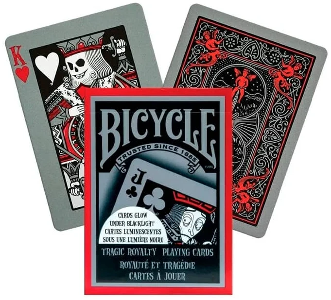 La baraja Tragic Royalty está diseñada con un atrevido dorso negro y rojo, y cartas de la corte caprichosas y macabras. La mayor sorpresa de todas: estos naipes brillan en la oscuridad bajo la luz negra. ¡El regalo perfecto para jugadores de cartas, coleccionistas de cartas, magos o simplemente otra forma de impresionar a los niños con una baraja de cartas para la noche de juegos en familia!