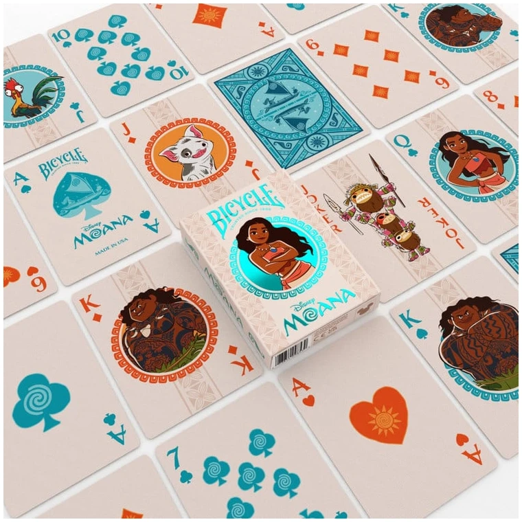 Con las Bicycle Disney Moana ¡Lleva tu próxima noche de juegos a una aventura marítima en Te Fiti con las cartas Bicycle inspiradas en Moana de Disney! Dentro encontrarás a Moana, Maui y algunos bocadillos de barco: el pollo Hei Hei y el cerdo Pua.